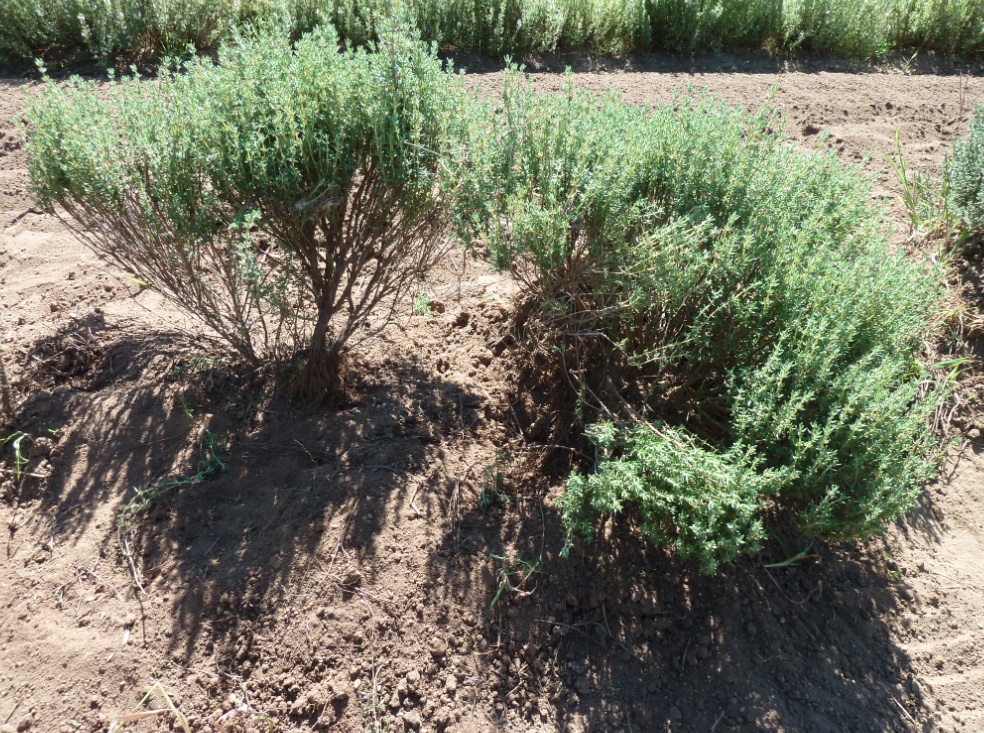 A kerti kakukkfű feltöltéses bujtással történő szaporításának mozzanatai: a. feltöltött anyanövény; b. leválasztott, gyökeres bokorrészek; c. telepítési anyag; d. kibontott, szaporításra felhasznált anyanövény; e. eltelepített bujtványok (Fotók: Pluhár Zs., 2011)