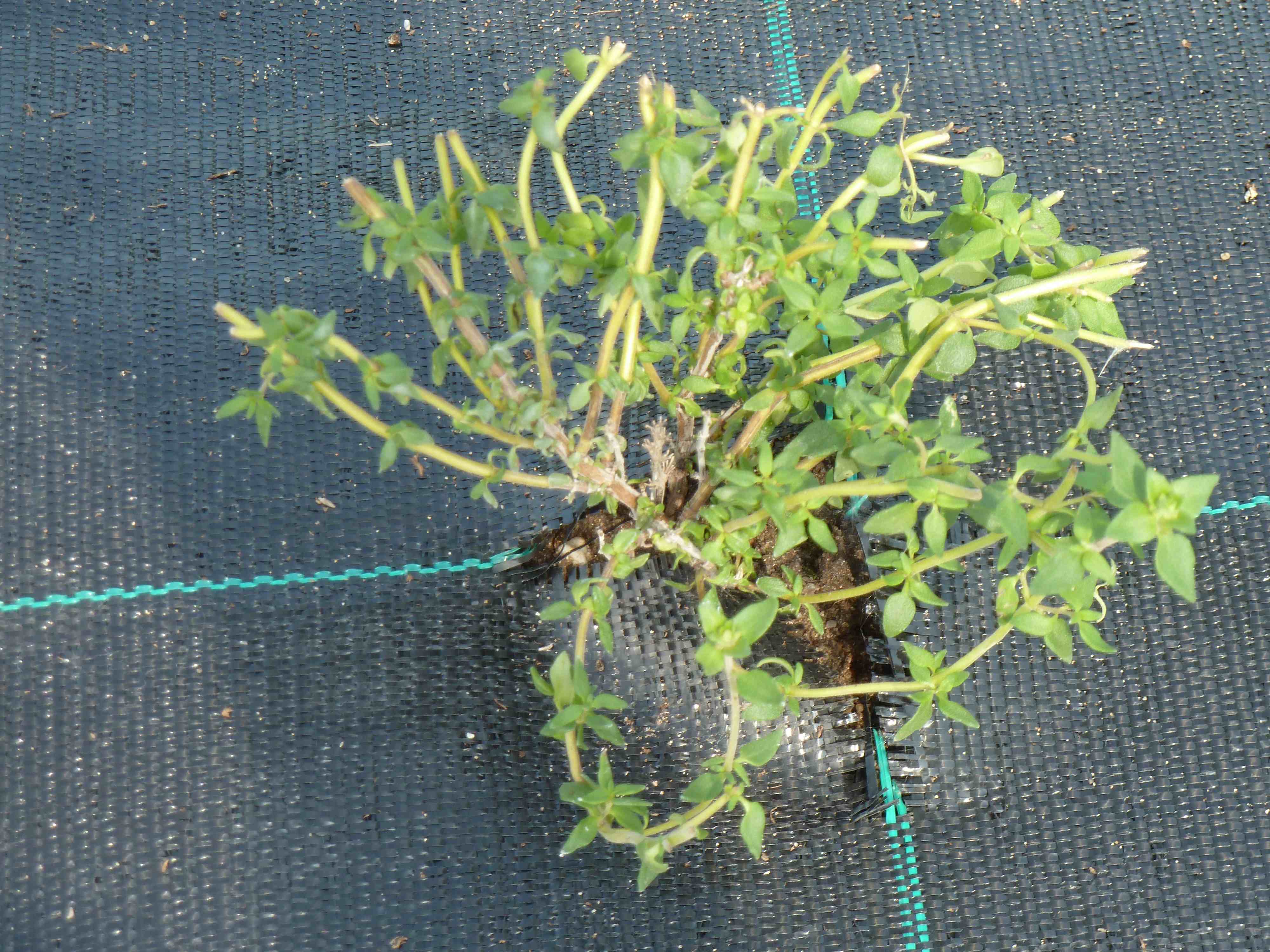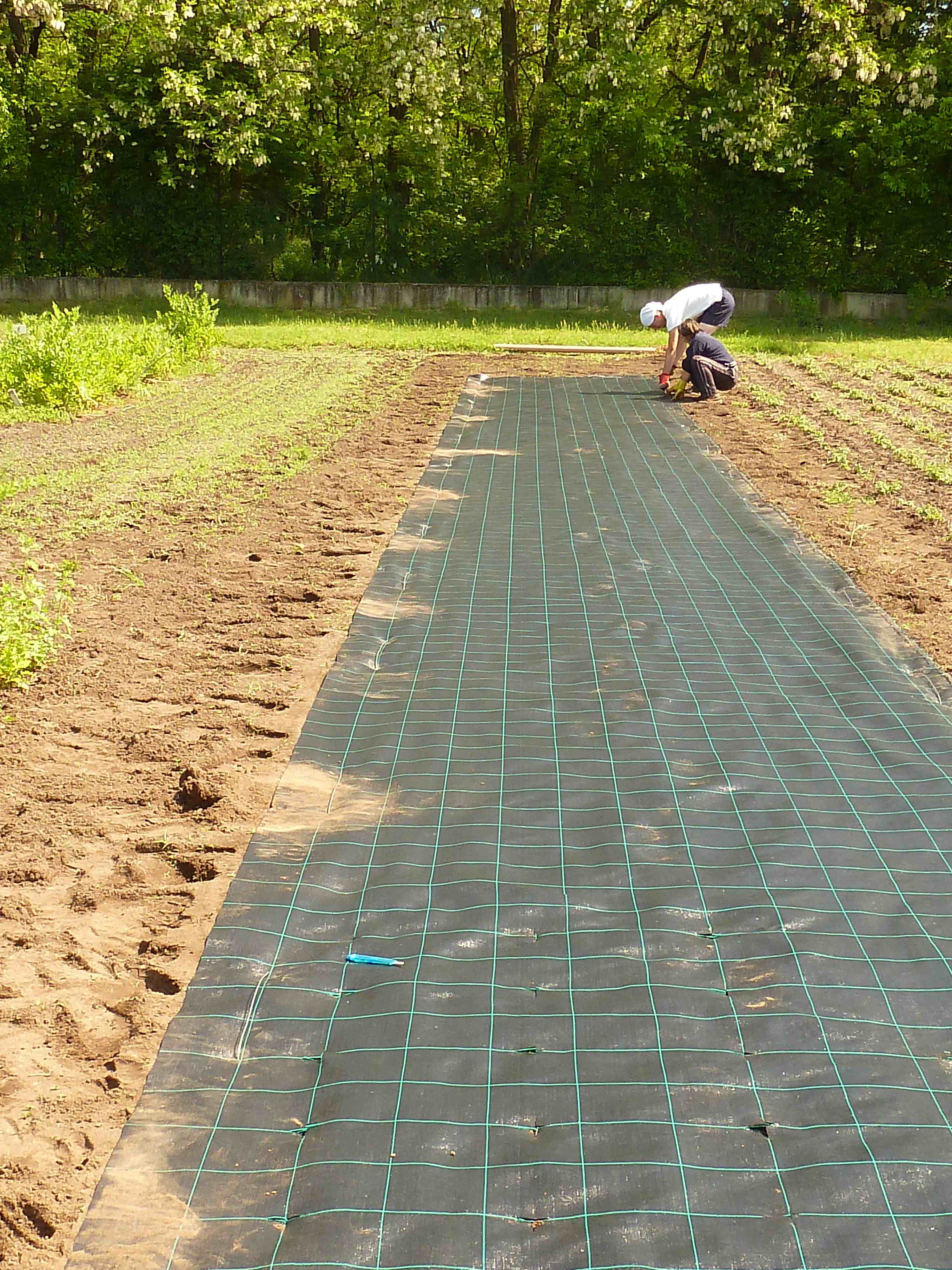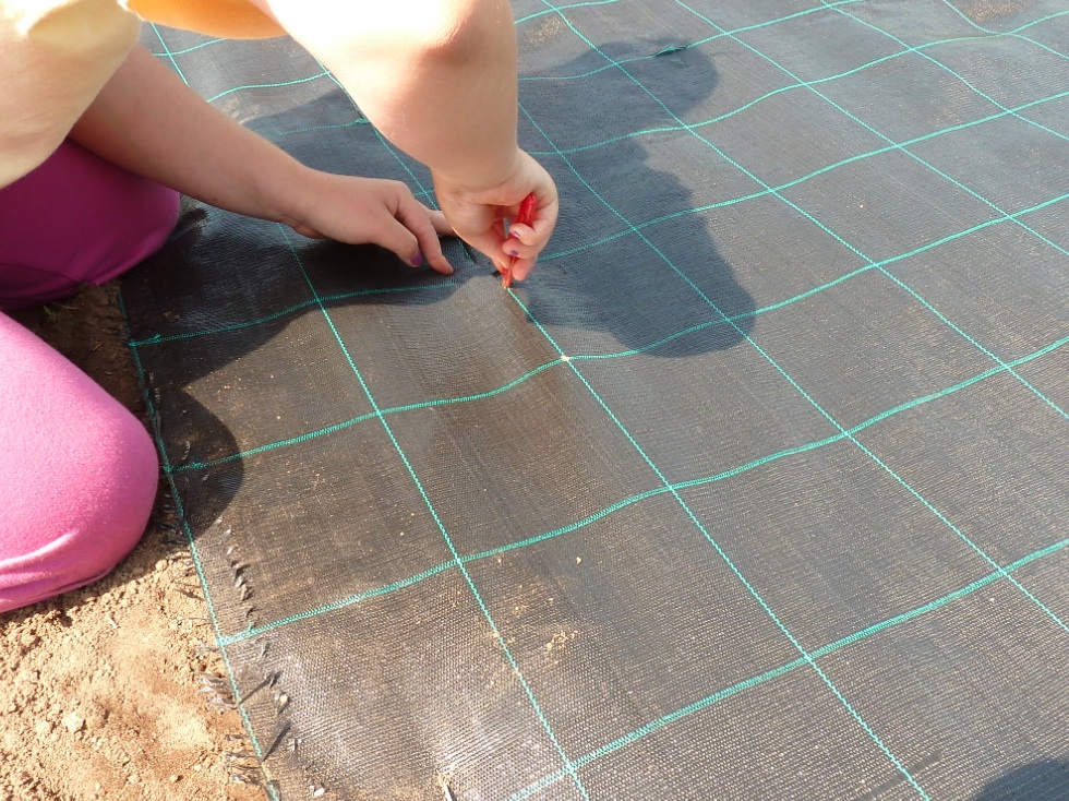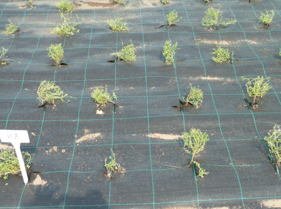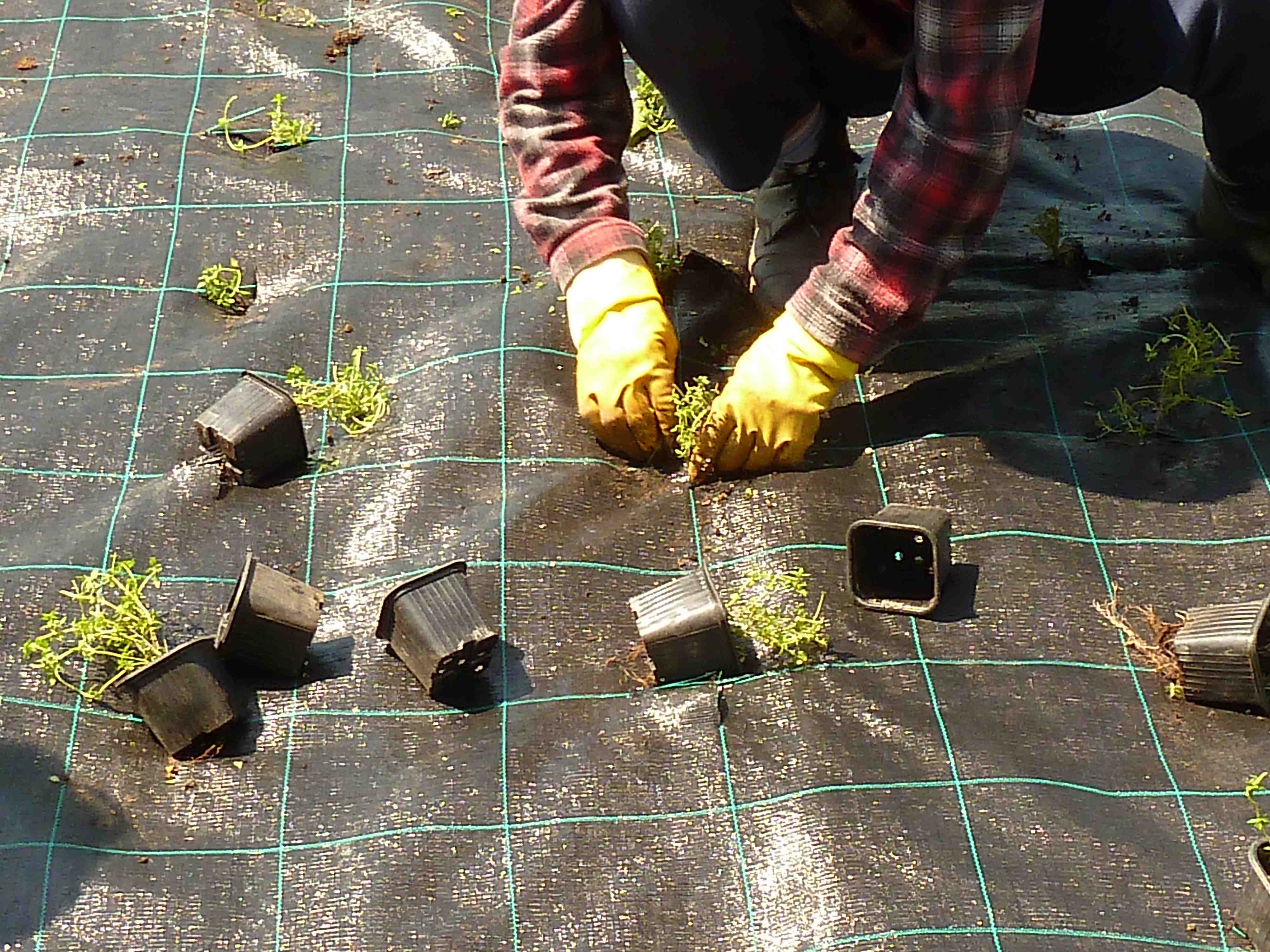 Kerti kakukkfű gyökeres dugványok kiültetése agroszövettel takart talajba (Fotó: Pluhár Zs., 2011)
